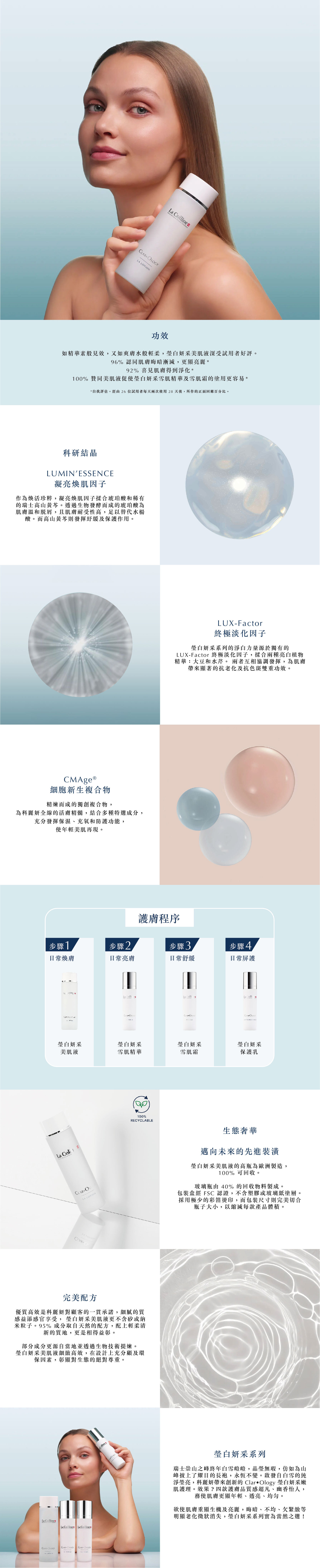 瑩白妍采美肌液啟動不老魔法。質感清新輕柔,成分中的琥珀酸發揮溫和脫屑作用,而稀有的瑞士高山黃芩萃取則可修復肌膚天然屏障。透過溫和淨化,肌膚重顯均勻無瑕。